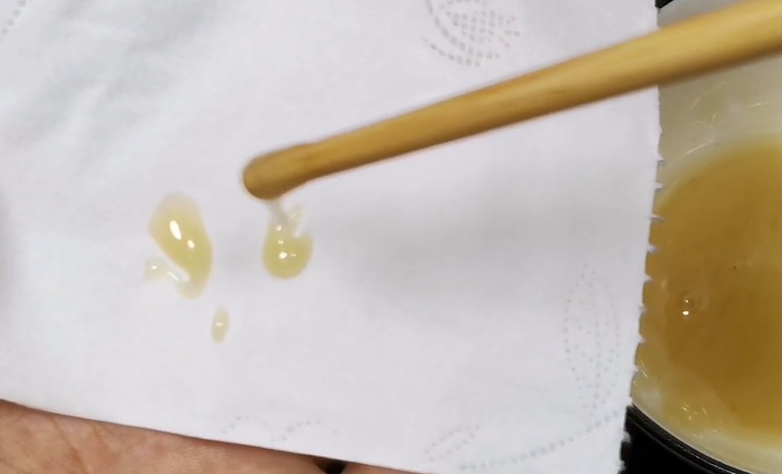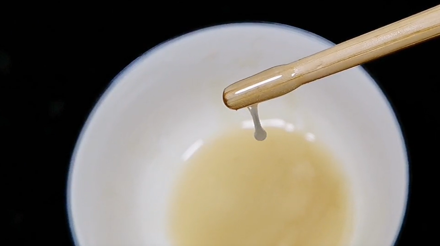 首先我们将蜂蜜挑起来,真蜂蜜挑起来,他成一条线,即使敌到最后他也会回弹回去,大家看到了吗?而假蜂蜜挑起来,它成滴水状的,到最后也不会回弹。