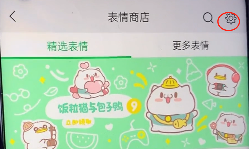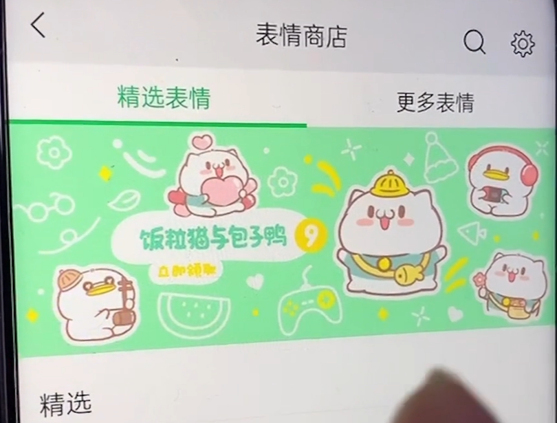 点击我,然后在设置上面有一个表情,大家看到了吗?咱们点击进去分为精选表情和更多表情,就是这个页面是一个表情商店,就是各种各样的表情都有。