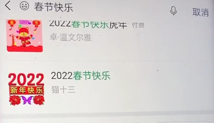 你可以直接在这搜,比如说春节快乐,你把这几个字输进去,然后点击搜索好,我们看出来啥,所有关于2022年春节快乐的这个表情就都出来了,然后你看到了吗?