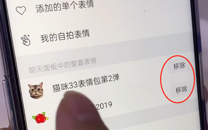 然后在这有一个聊天面板中的整套表情,如果你想把它删除,就点这个移除,你看这两个,一个喵咪,还有这个花,就是刚才我表情包里有的个表情,我就点移除,这就可以啦。
