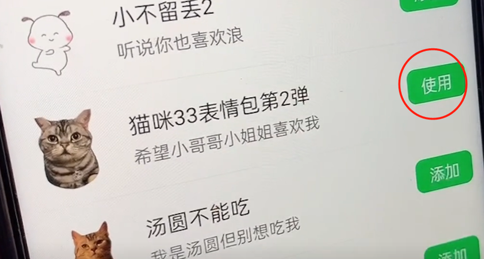 首先这里是精选表情,就是说比较用的人比较多,比较优秀的种表情,比如说这个猫咪表情,咱们先点击添加,点击添加以后他就会添加到你的表情包里,效果是什么样子的?