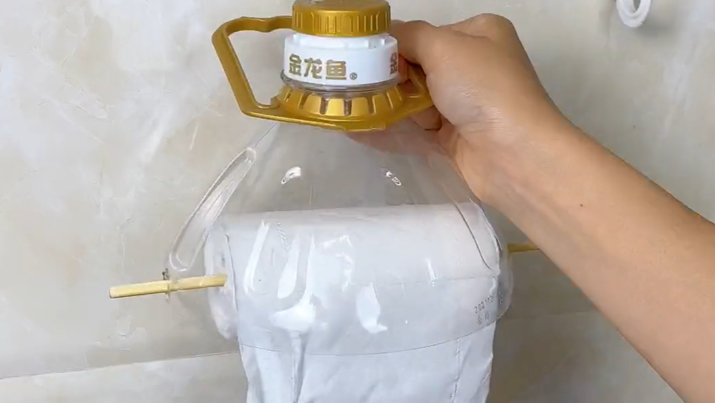 说完油桶的下半部分,它的瓶口部分也是有使用价值的,先用同样的方法将它的两边都钻一个孔,然后取出家里面的纸巾,这样用一次性筷子穿起来,接下来将纸巾用这个方法安装在油桶盖的上面,这样一个多功能纸巾盒就完成了。