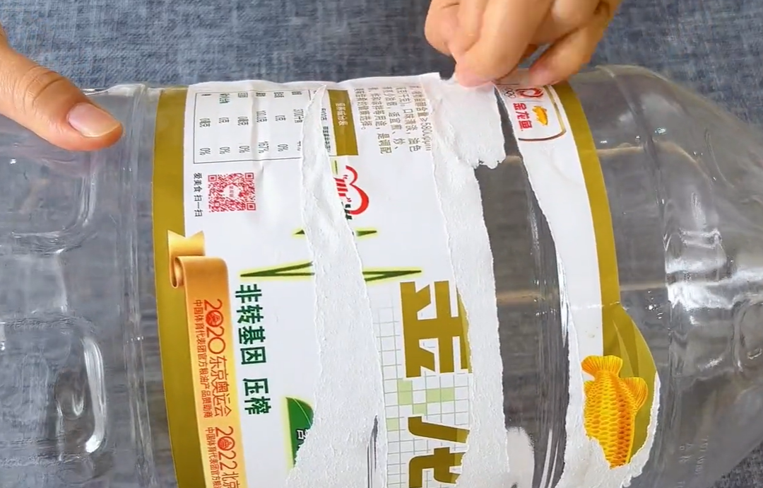 很多朋友之所以选择把油桶直接扔掉,很大一部分原因就是觉得清洗很麻烦,所以今天顺便跟大家分享一个一分钟清洗油桶的小妙招,洗完了油桶干净透亮不油腻。准备好的瓶子,我们要先把它表面的标签给撕下来,在撕扯标签的时候,大家是否也是这样,油桶上面遗留的胶印怎么也撕不掉,用指甲抠还越抠越黑,越洗越脏,因为这些胶印不容易碎,所以就会怎么洗也洗不掉。这个时候我们就可以用一个巧妙的方法来去,除了用家里的酒精,一般药店买回来的都可以用。