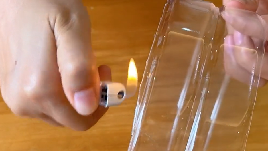 剪下来的塑料瓶边缘有很多的毛刺,为了后面使用的更顺手,我们用打火机将其烤一烤。上面的毛刺预热就会融化收缩,变得圆润,这样后期使用就不怕伤到自己啦。修剪好的这个项圈我们到底有什么用?一起看看吧。