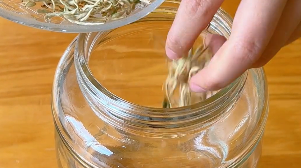 准备一个大玻璃罐,我们将金银花放在罐子里边,不需要去清洗它,这样可以保留它更多的清香味。现在来看看薄荷,水分都晾干了,这时我们用剪子将薄荷剪成小段,薄荷剪成小段过后方便浸泡,它里边的营养物质也更容易释放出来。