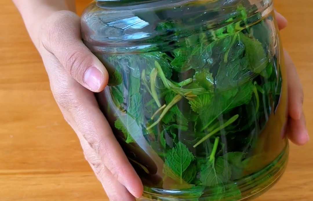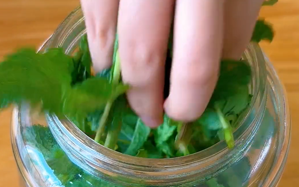 今天用到的薄荷和金银花虽然放在我们农村确实很不起眼,但是它们两个却都是不可多得的,是可药用和食用的药食同源的食物,所以我们用它自制花露水,可以说是非常的安全,没有任何的副作用。全部剪好了,现在将它装入罐子里边,装的时候稍微用手压一压,因为薄荷它看似装满了,但实际泡发了过后它会焉的。