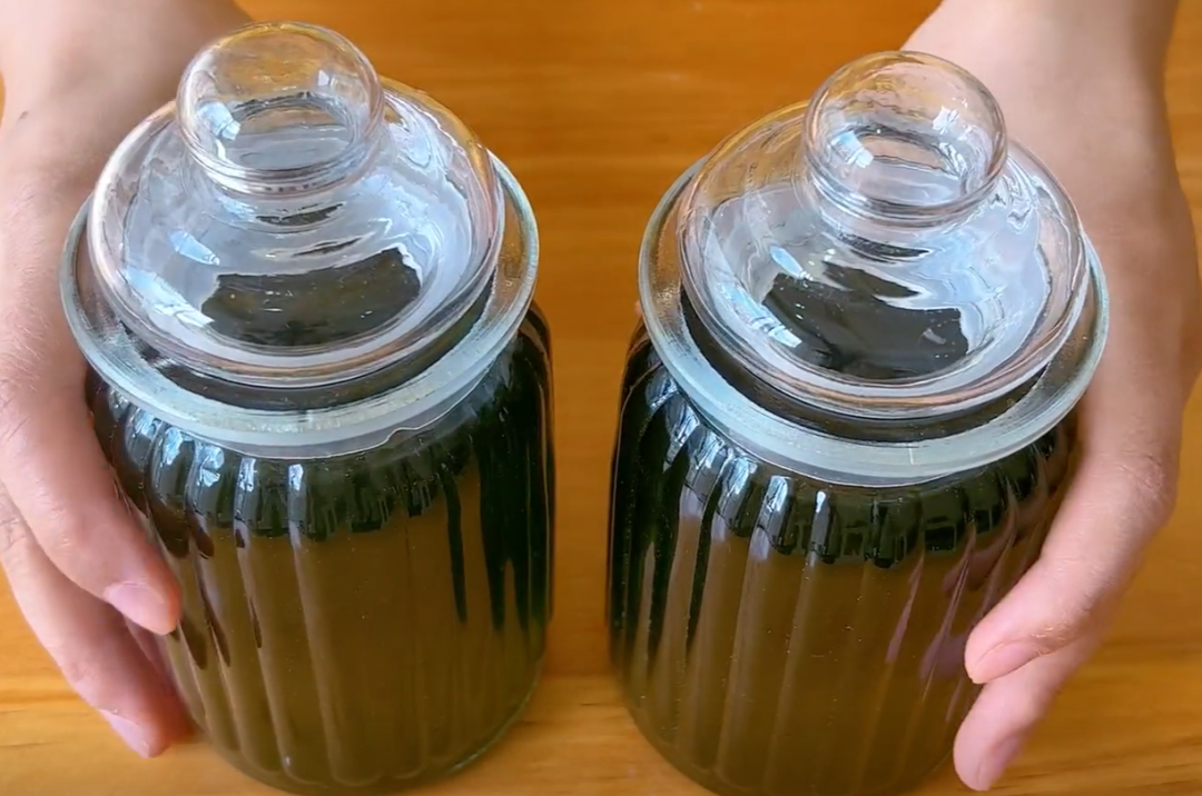 因为酒精非常容易挥发,所以这边我准备了两个密封罐,如果您家里的罐子密封性不好的话,可以用保鲜膜后再盖盖子,我们将原液倒入密封罐里边,后期密封储存,可以存放一年都不会变质哦。容器就建议大家选择玻璃容器,不要选择一些铝制品或者是劣质的塑料制品来盛放,避免被溶液腐蚀,现在将它们放在阴凉干燥的地方储存就好了。每次使用的时候,都用干净的容器取出,用多少取多少,非常的方便。这么两大罐,我家一家五口人够用一年啦,是不是很简单?