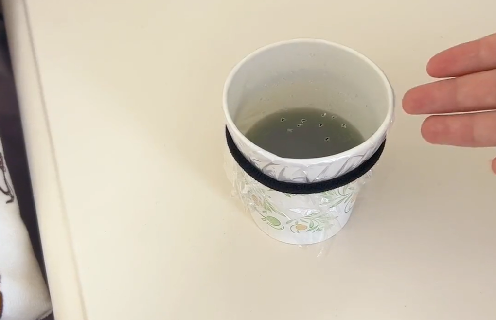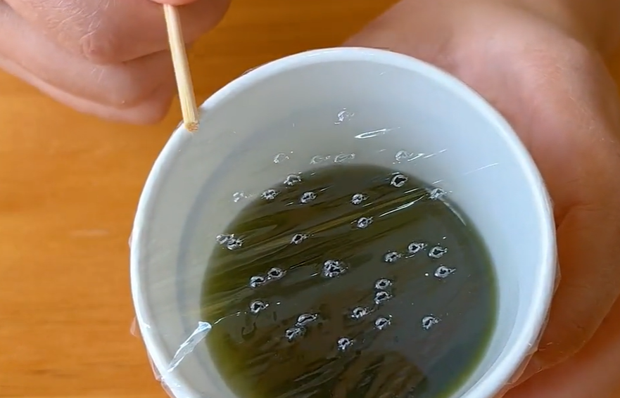 除了以上这些,我们还可以将它做成驱蚊器,拿出家里用过的一次性纸杯,将原液倒入杯子里面,这里不用清水稀释都可以,然后盖上保鲜膜,用胶带固定住。这样做主要是为了防止被宝宝不小心打翻了,它也不会洒出来。然后我们用牙签在上面戳一些小孔,让里边的气体可以散发出来。做好了之后,我们可以将它放在蚊虫容易出没的地方,就比如我们的厨房,客厅,床头边都行。