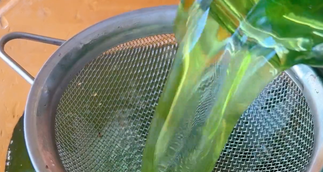 材料我也是随意放的,薄荷放得多一点,使用起来就会感觉更清凉一些,感受不一样。我存放了六天,现在大家来看看颜色是不是非常的翠绿,看着就是夏天的感觉。我们将里面的液体过滤出来,之所以酒精会变绿,是因为酒精把薄荷跟金银花包中里边的叶绿素溶解到了酒精里,我们看到的绿色就是植物中的叶绿素,其实这就是我们自制的花露水原液啦,是不是特别的简单?