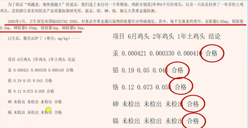 “十年鸡头胜砒霜”主要说的是鸡头重金属污染物的问题,国家标准对食品中的污染物有限量要求。浙江省农科院曾经就两个年头和六月龄的鸡头中的重金属含量进行了测定,发现没有大的差异,并且也都符合国家标准。鸡的实际寿命是六到七年,随着鸡肉食用量的增加,鸡的生长周期缩短,很少食用到十年以上的鸡。
