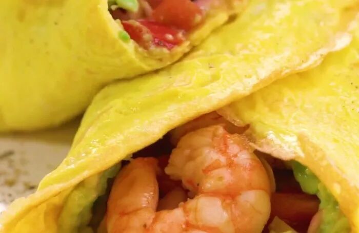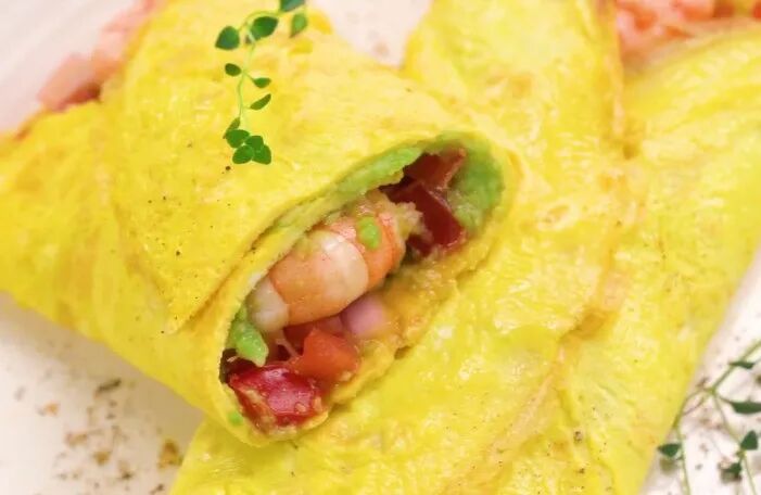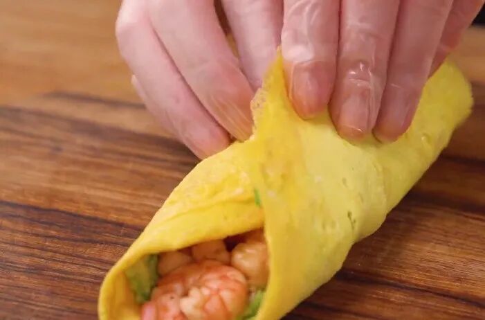 第三步:最后先在鸡蛋饼上面抹上一层牛油果泥,然后把炒至断生的食材铺在表层,卷成卷就可以直接开吃了。