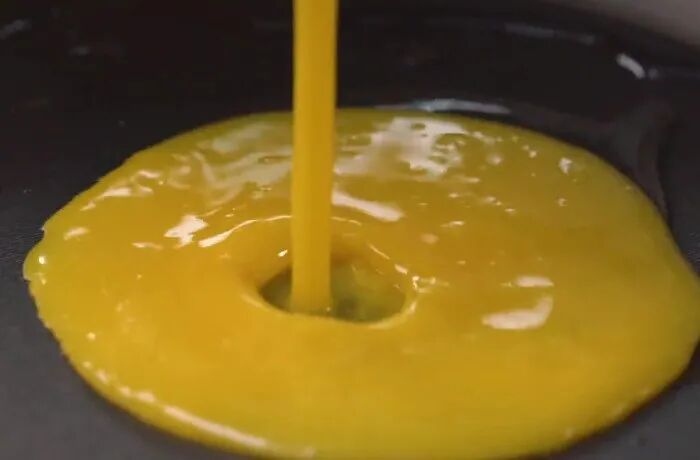 第二步:随后把准备好的鸡蛋打散于碗中,而后把蛋液分3份倒入预热五成油温的油锅中,左右摇晃锅底,煎出三块直径不低于15cm的鸡蛋饼;在三块鸡蛋饼完全出锅之后,直接把刚才搅拌好的原材料倒入锅中,大火翻炒1分半钟后迅速出锅。
