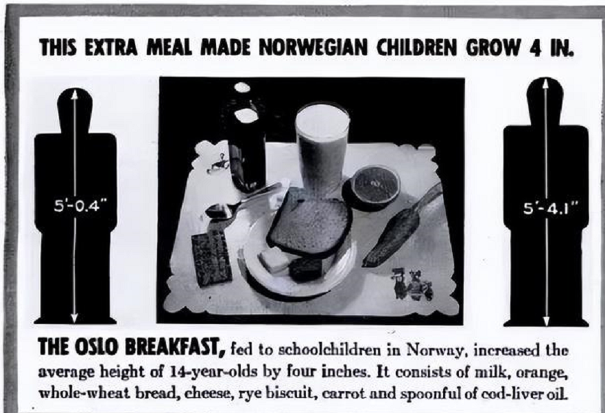 而英国的教授德拉蒙德对此发表过公开声明:食用奥斯陆早餐的伦敦儿童,比附近其他城市的孩子,明显脸色更好,身高也高出了25%。