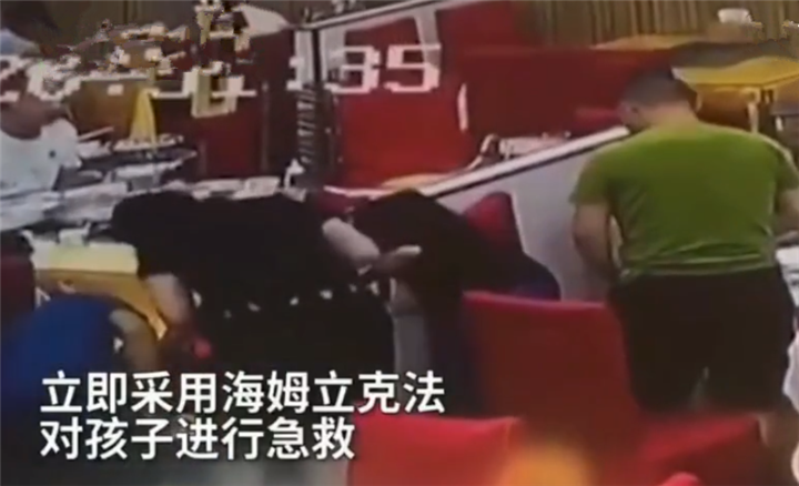 这时坐在邻桌的一个好心人看到,马上过来将孩子抱起,利用海姆立克法将孩子急救过来。