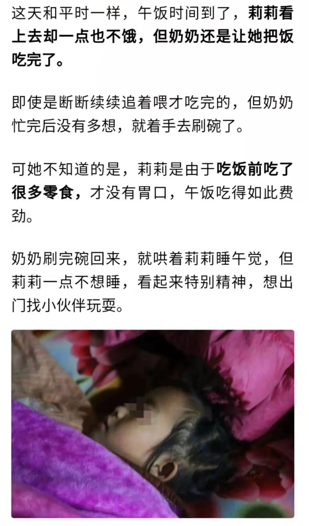 午饭过后,莉莉想出去找小朋友玩,但奶奶不让,非让睡醒了再去玩,莉莉扭不过就睡觉了。谁知这一睡,孩子再也没醒过来。