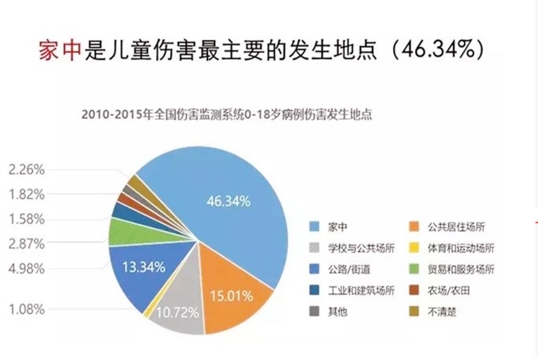 其实,相比较户外的危险,家里更是对孩子威胁较大的地方。据《中国青少年伤害现状回顾报告》显示:家中是儿童伤害最主要的发生地点,在所有伤害发生地点中占46.34%。