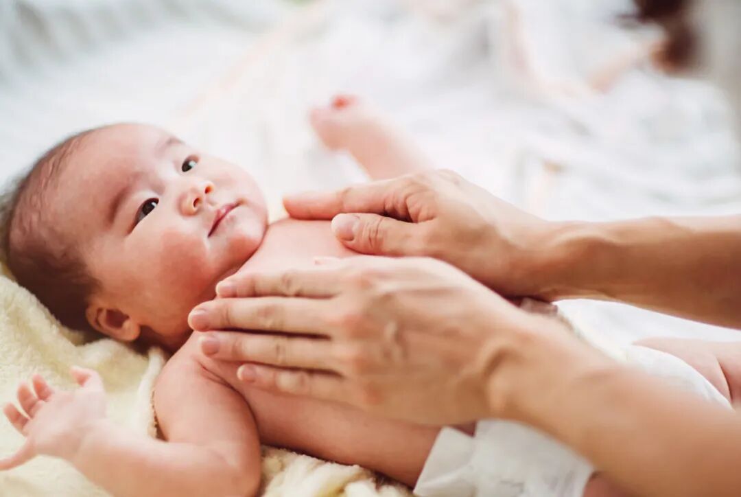 当宝宝一直哭闹、脸色涨红,还不停蹬腿的时候,很可能是肚子胀气了,一般情况下,轻轻给他们由上至下地按摩腹部就行。