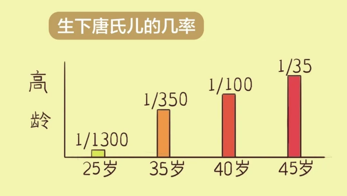 生下“唐氏儿”的概率高低与母亲的妊娠年龄也有密切关系,25岁以下的母亲生下唐氏儿的概率约为1/1300;35岁时概率约为1/350;40岁时概率约为1/100;45岁时概率约为1/35。