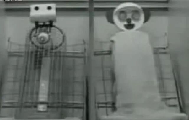 而结果是:小猕猴在饿了的时候才会找"铁丝妈妈",但是之后就依偎在"毛绒妈妈"的怀里。当在笼子里放了一只"怪物"之后,小猕猴就会扑到"毛绒妈妈"的怀里寻求安全感。