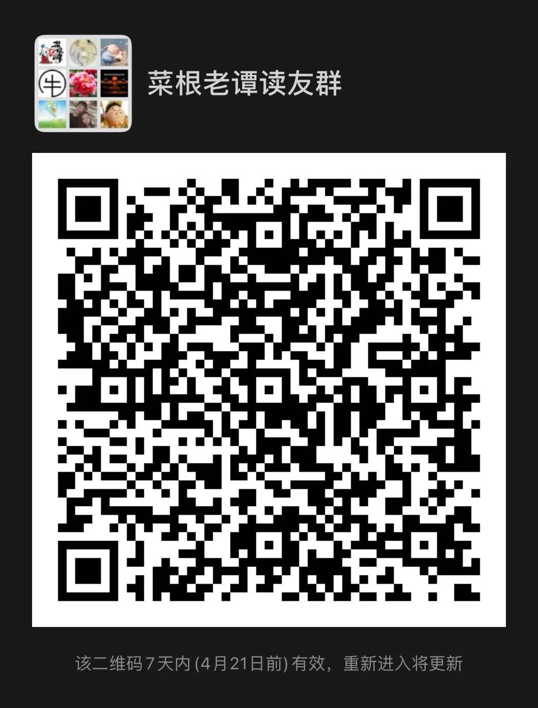 您可以加入菜根老谭的读友群,和群友一起聊技术、聊产品、聊运营、聊职场、一起读书、一起学习。