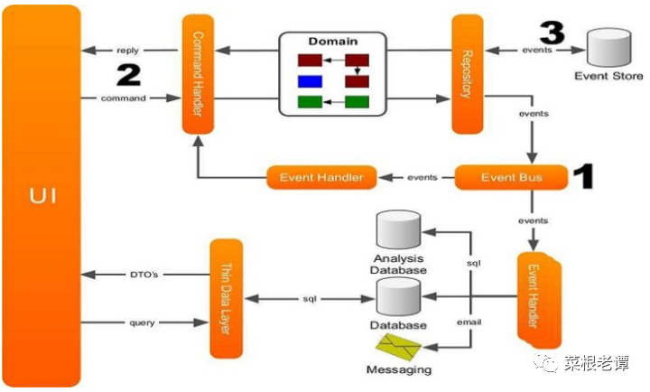 其一是将命令作为事件推送到消息中间件处理,以避免出现长周期分布式事务。其次就是启用单独的R读库,可以是数据库,也可以是缓存库,来实现查询功能独立解耦和性能提升。