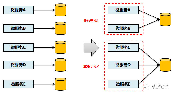 显然,在这种场景下我们引入业务域的概念,即应该按业务域或子域来拆分数据库,可以多个微服务共享一个数据库。在多个微服务共享一个数据库实例的时候,微服务本身没有做到完全解耦,但是也可以实现代码层解耦。