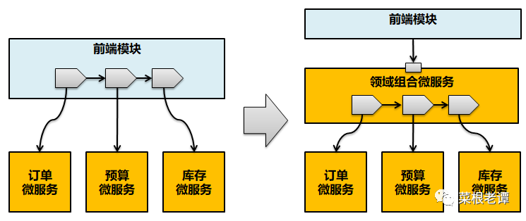 在DDD领域驱动设计的架构分层里面,在领域层上有一个独立的应用层,这个应用层即和这类谈到的领域组合微服务对应。而下层的领域层则由多个微服务提供粗粒度的API接口服务能力。