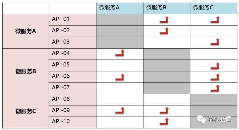通过上图的接口交互矩阵,可以很清楚的看到当某个接口出现变化的时候,究竟会对哪些微服务模块,哪些功能造成影响,那这些影响点就必须考虑配套的变更或者说在提交测试的时候,这些影响到的微服务模块或功能也需要进行测试。