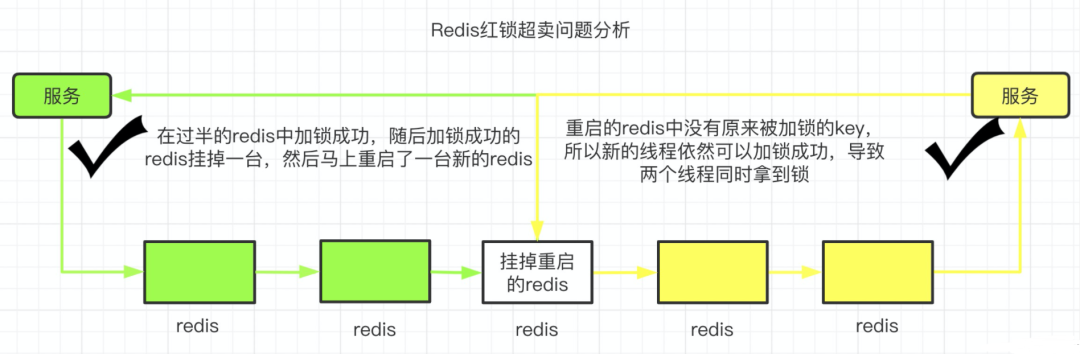 如果运维小哥很勤快,做了自动化,Redis挂掉之后,马上重启了一台,那么重启的Redis里没有之前加锁的key,其他线程依然能够加锁成功,这就导致两个线程同时拿到锁。
