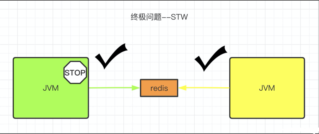 当遇到FullGC时,JVM会发生STW(Stop The World),此时,世界被按下了暂停键,执行任务的主线程暂停了,用来续期的狗(watch dog)也不会再续期,Redis中的锁会慢慢过期,当锁过期之后,其他JVM又可以来成功加锁,原来的问题又出现了,同时有两个服务拿到锁。