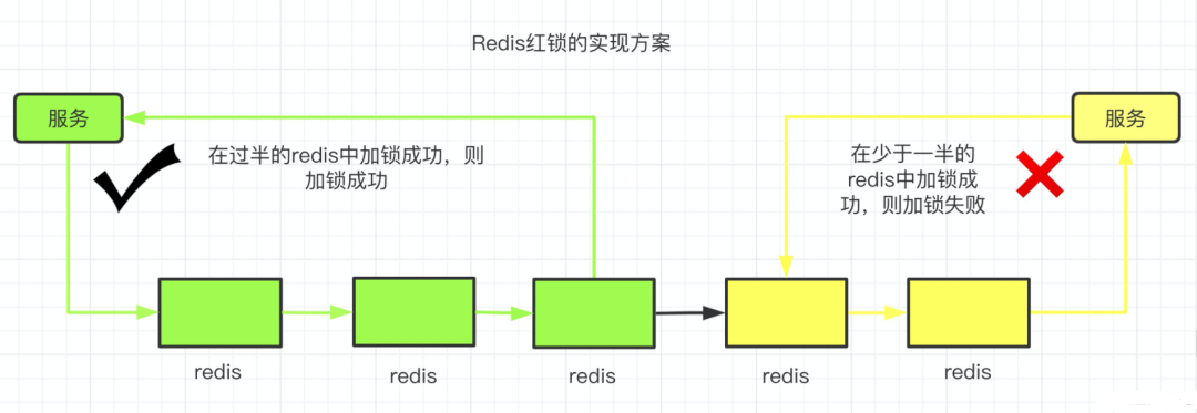 加锁时,在一台Redis上加锁成功后,马上去下一台Redis上加锁,最终若在过半的Redis上加锁成功,则加锁成功,否则加锁失败。