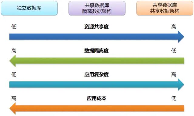 基于上述方案进行论述,通过三种方案的公优缺点进行对比,我们从资源共享、数据隔离、应用复杂性、应用成本四个方面进行对比总结。通过下面一张图来概括说明 。