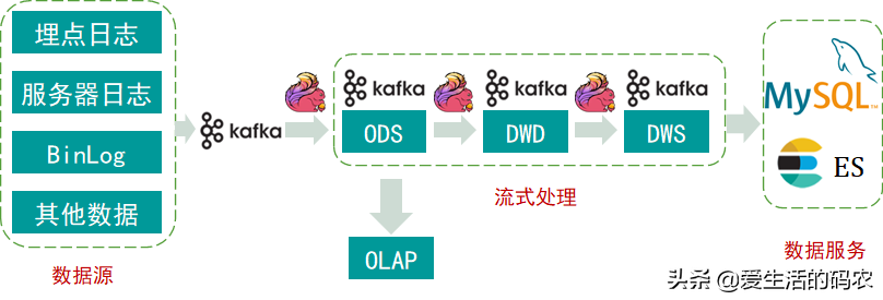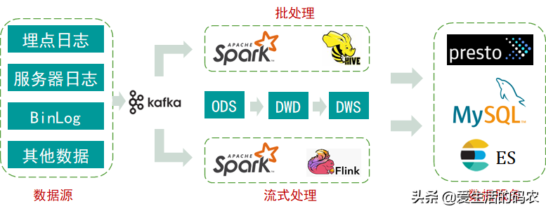从底层的数据源开始,通过Kafka、Flume等大数据组件,将各种各样的数据同步到大数据平台,然后分成两条线进行计算。一条线进入离线批量数据处理平台(Spark、Hive、MapReduce等),去计算T+1或者H+1的业务指标,这些指标需要T+1或者H+1才能看到;另外一条线是进入到实时数据处理平台(Flink、SparkStreaming等),去计算实时统计指标。