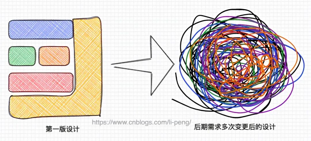 大多情况下编码设计质量最高的时候是根据第一版需求进行编码实现的时候,但只要需求一变更,就会打乱原来的编码设计,软件质量也就会越来越差。或者就没有了设计。