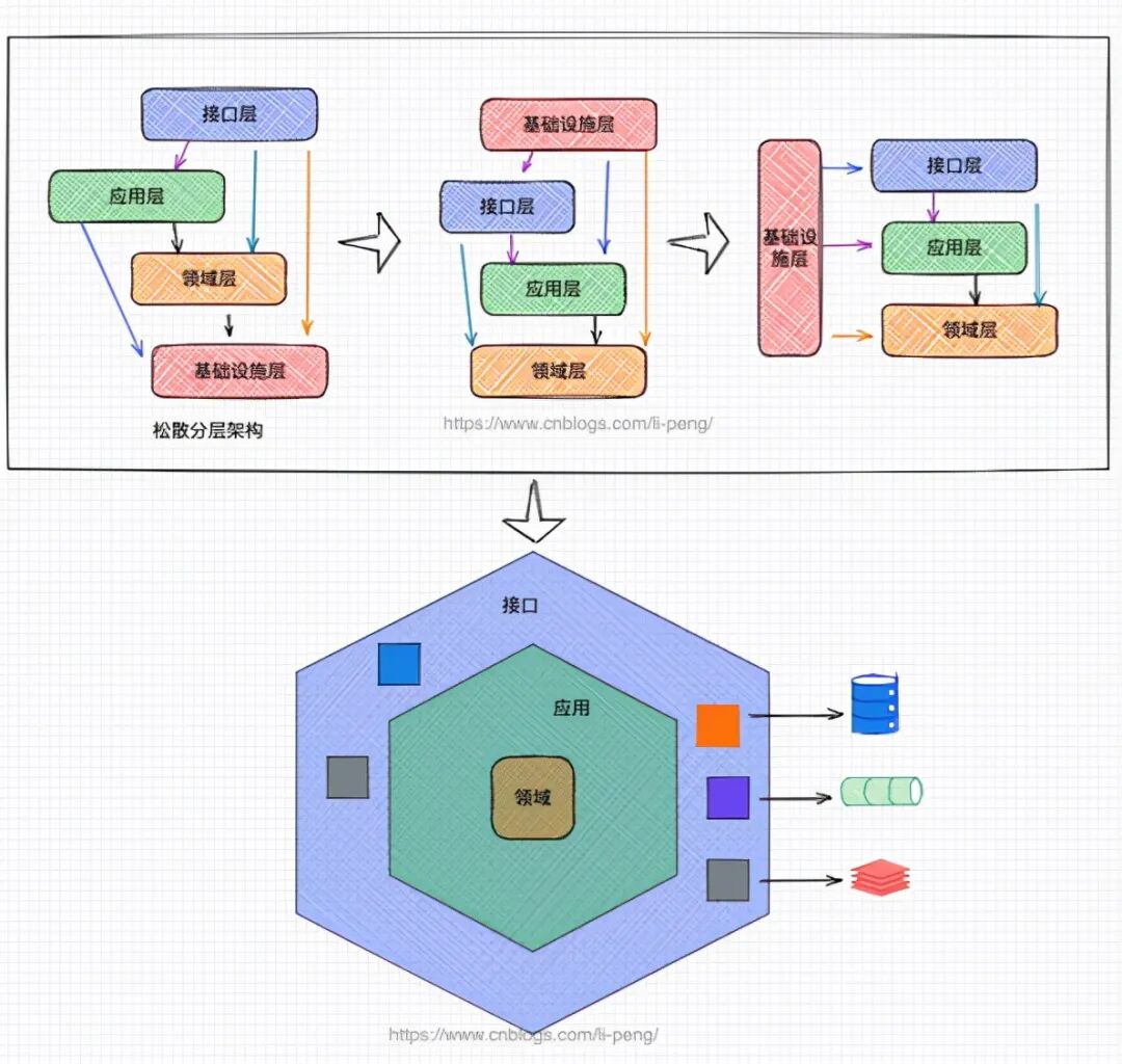 应用依赖倒置后,我们调用的是抽象接口,你会发现层的概念没有了,层的概念被打破了,我们可以更激进一点把基础设施层剥离出去用各种适配器去接入各种组件,把层的关系拉平,把架构调整为六边形构架