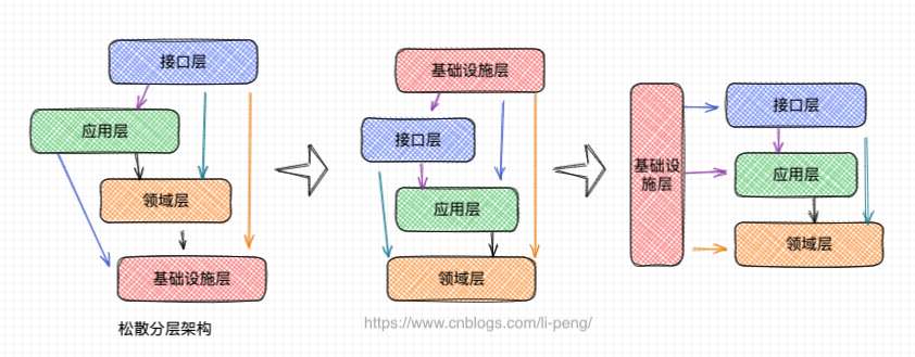 后来又加入了缓存,又加入了消息队列,业务的不断扩张又加入了不同的数据库nosql,业务的升级有了v2.0,v3.0,新业务要兼容旧功能等等,如果还是原来的分层结构,很快就会出现逻辑代码堆积的问题,业务层之间引用杂乱,一个代码文件几千行代码,需求变动时牵一发动全身,及时调整架构的必要性就体现出来了。一定要复用好依赖倒置原则,层与层之间不应该依赖实现,要依赖于抽象,比如我们的基础设施层要为其他三层提供支持,基础设施层可以实现其他层定义的接口来进行抽象,从这个角度来开的话我们的基础设施层应该在最上面,也可以是左边或者右边