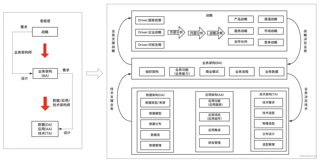 在TOGAF企业架构理论中, 架构是从公司战略层面,自顶向下的细化的一部分,从战略=> 业务架构=>应用/数据/技术架构,当然老板层关注的是战略与业务架构,我们搬砖的需要聚焦到应用/数据/技术架构这一层。