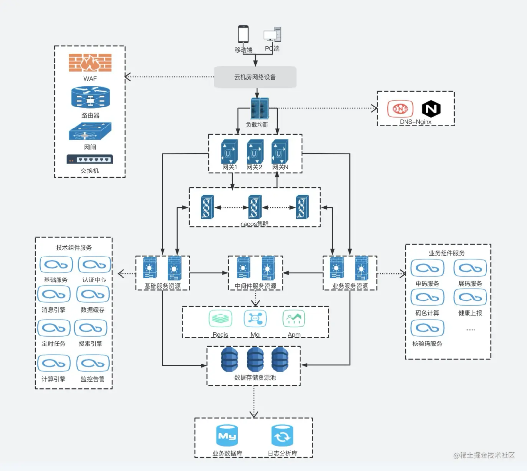 技术架构: 描述了需要哪些服务;选择哪些技术组件来实现技术服务;技术服务以及组件之间的交互关系;