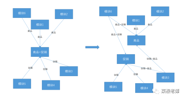 以上的几种常见的实际的分布式架构应用都恰恰的完全匹配了上图中分治的思想。但是,这种分治方式,需要满足一个最重要的条件:不同分支上的子问题,不能相互依赖,需要各自独立。因为一旦包含了依赖关系,各部分之间就存在了耦合度,整个体系的复杂度就提升了。在分布式系统中,往往根据业务垂直切分的分治方式,就不可避免的存在依赖和耦合。比如一个电商平台,为了应对更大的访问量,需要拆分一个同时包含商品、促销的系统,拆分后如下图所示,各分治单元之间依然存在耦合关系。