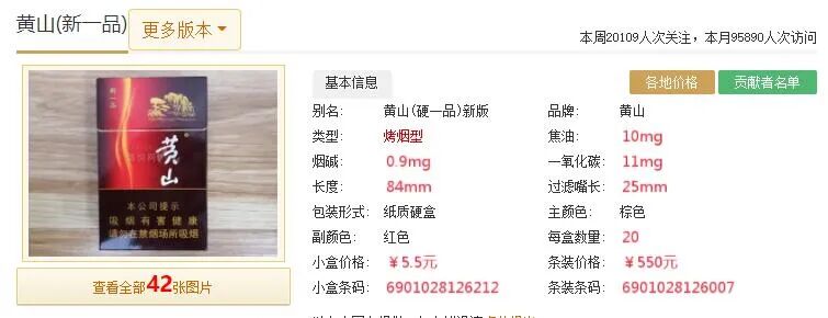 黄山(新一品)香烟基本信息 俗名:Huangshan Yipin New