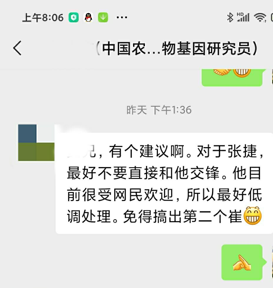 我还有一位朋友是看的很清楚的,他是真的不希望你继续陷在错误里面。逐渐推广转基因从去年开始,就已经是中央政府的既定大国策,转基因在主流科学界早就没有任何争议。现在,恨你、反对你张捷的人,他们都在准备看你笑话,你越反对转基因,就越犯错误。批评你,就是帮助你,为你预警。你陷入越深,犯下的错误越大,反对你的人就越高兴。我们又不会损失什么,我仅仅是好意提醒你,哪怕你不信我的好心也无所谓。