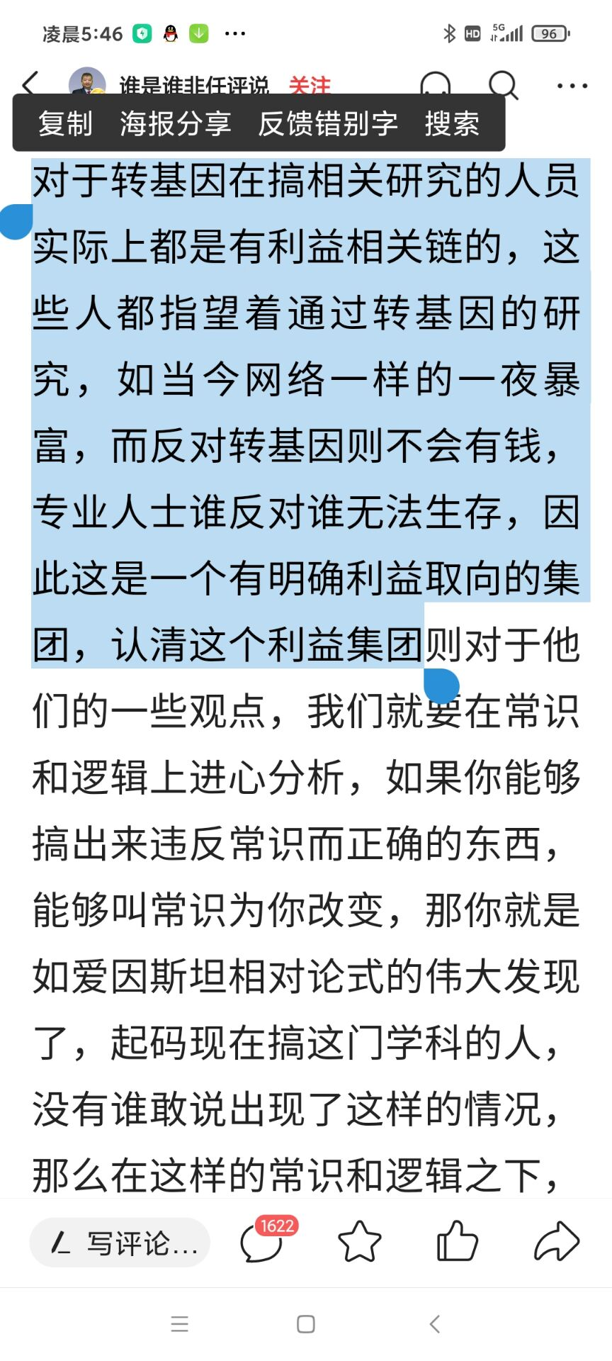 我和一位朋友进行了对话。我说,某山都只是转基因企业中排名并不特别靠前的存在,它的估值还不到华为的一个零头,这么一点实力怎么能决定科学界的共识?它如果那么厉害,为什么被德国企业拜耳收购了呢?转基因已经研发50年,有几百万科研工作者的参与,几十个国际权威机构的认证,区区一个某山都做不了“全体收买”。我做过量化计算,要做到有限的控制舆论,理论上起步40万亿美金一年。如果它这么厉害,这么有钱,都可以建立一个超级大国了,根本不必要辛苦的去搞科研,还要弄什么专利。