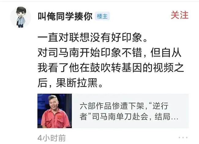 仅仅因为司马南支持政府和科学界对转基因的决策,这个网民就拉黑了司马南。