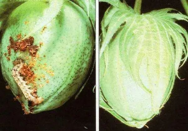 普通棉桃(左)和转基因抗虫棉桃(右)