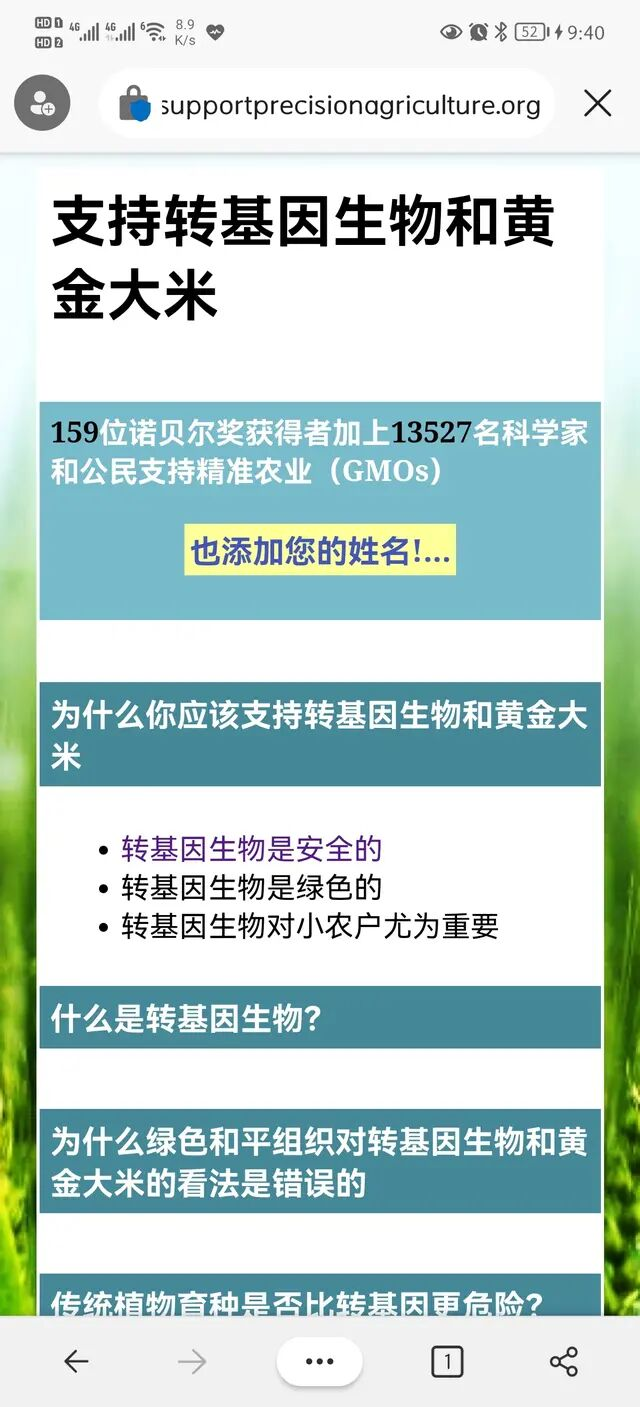 美国一个国家说转基因安全,那是没用的。但问题是全世界都支持转基因,而且支持了51年之久。
