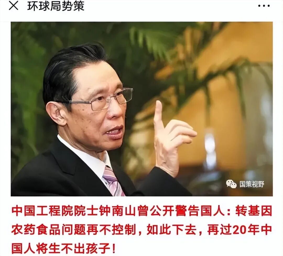 但是,到了第二个自媒体公众号,直接把句子改为:钟南山说,“转基因再不控制,就生不出孩子”。