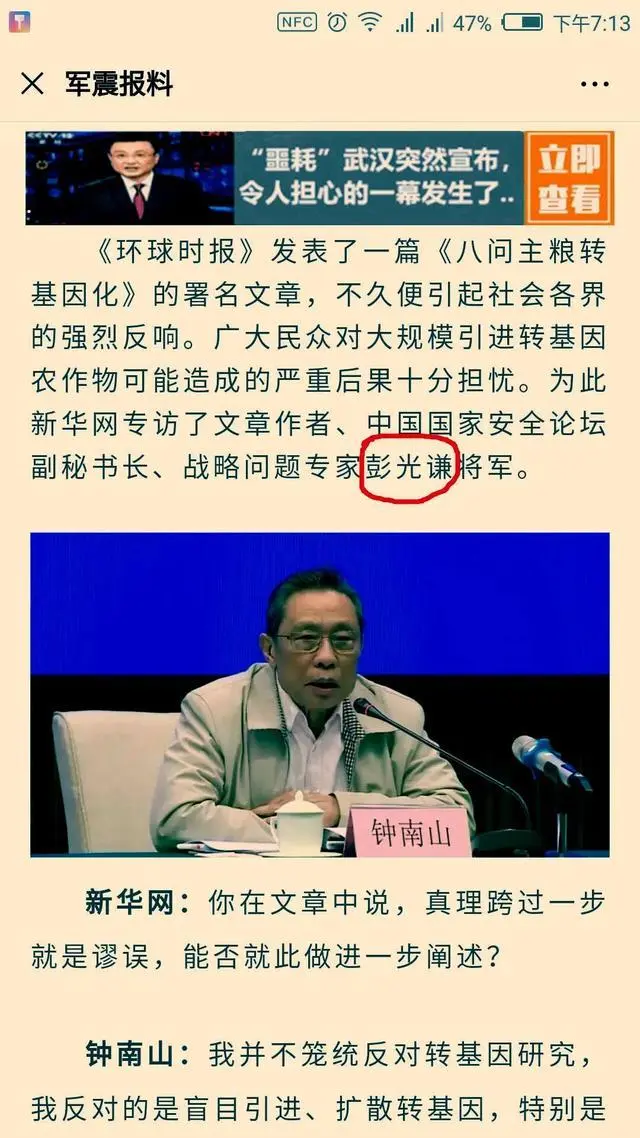 截图中的彭光谦的那段话,是10年前的老梗,被证明完全是错误的东西,辟谣了无数次。他本人并不是专业科研工作者,和我们一样其实都是普通网民。一个普通网民误信了谣言,说了几句没有营养的话,因为职位比较高,就成为了被反转人士利用的工具。但我也要说明的是,第一,针对彭光谦的所有说法,中国农业科学院官方网站有专题文章反驳,是中央级科研机构的权威论断;第二,截图中划线的那几句话,也不是彭光谦本人的原义,他根本没有说过。