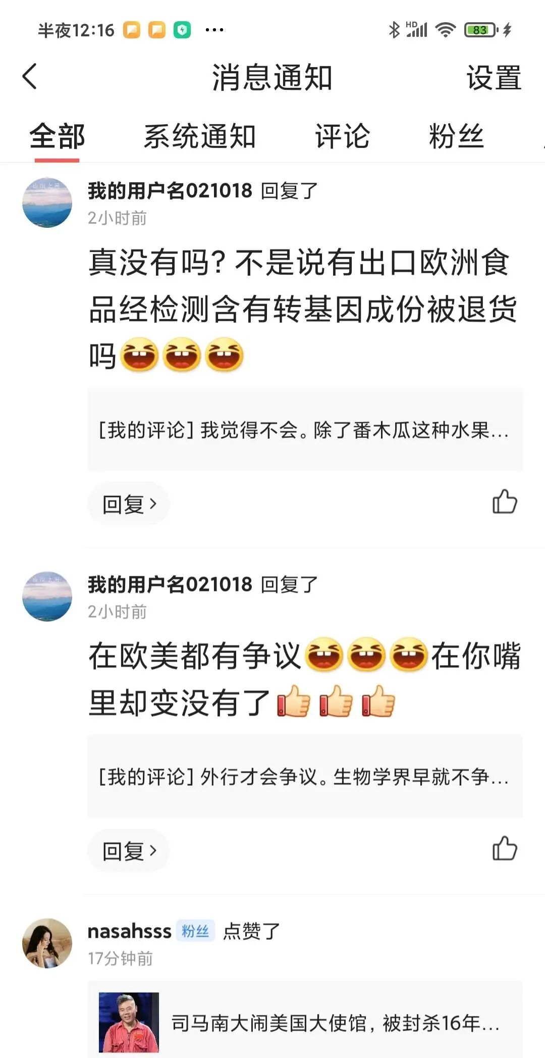就在凌晨过后,我刚刚在留言区拉黑了一个网民@我的用户名021018。这个人完全不懂转基因知识,也完全不懂国家政策。我拉黑他,不是因为他不懂,而是因为他对我使用了恶意对抗和讽刺意味的表情包。