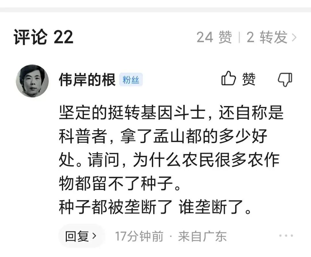 我可以告诉你,所谓孟山都垄断种子是根本不可能的,因为中国政府根本不予以承认,而且早就通过立法给了农民留种豁免权。此外,孟山都这家企业在2016年已经不存在了,她已经被德国收购了。