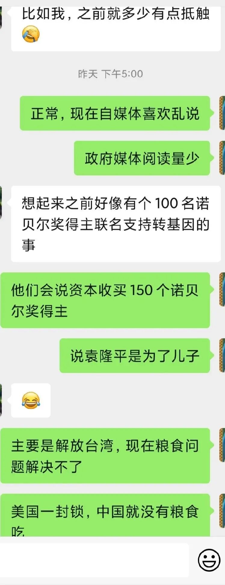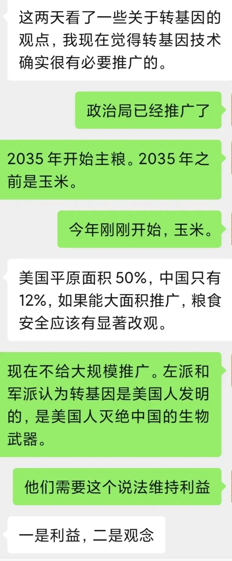 这是一位理工科出身的朋友和我的聊天记录。他原本是抵触转基因的,之前看了一些自媒体对转基因的妖魔化报道,难免对这项生物育种技术有些不放心。可是他通过学习逐渐改变了主意。